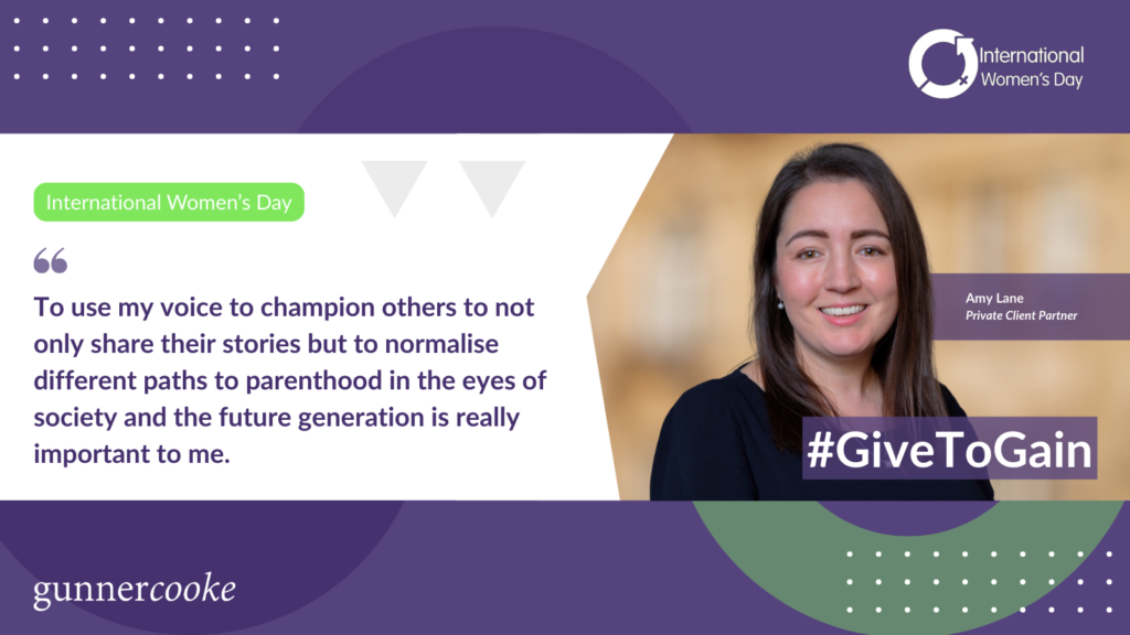 Amy runs a ‘Paths to Parenthood’ campaign, where she uses her voice to challenge outdated ideas of what is considered “normal” and to support those facing adversity, loss or uncertainty on their journey to becoming parents through unorthodox means, using her legal knowledge and interpersonal skills to support families going through this process.